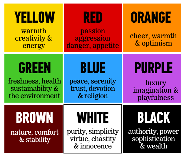 So blue might convey a feeling of trust, calm, masculinity, while yellow makes you think of creativity, summer, positivity.
