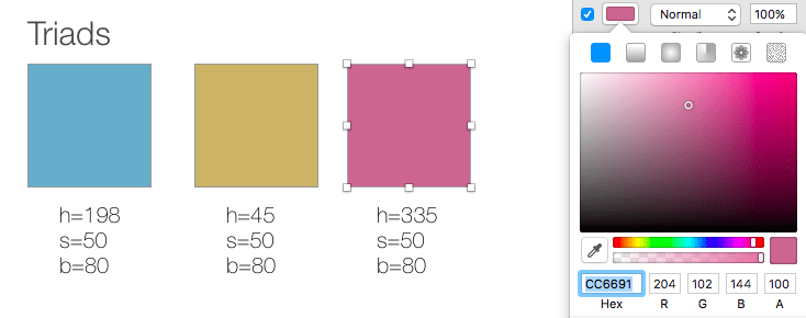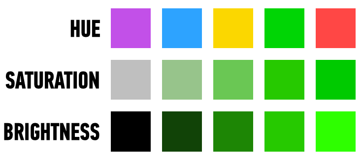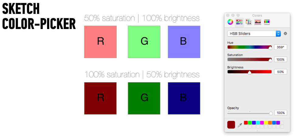 There are a couple of other ways you can mix light to make colors. If you’ve ever played around with the HSB settings on your Sketch color palette, you’ve seen how to make colors blacker, more pastel, and more vivid using combinations of hue, saturation and brightness.