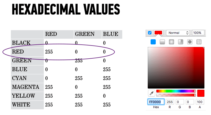 Above is the table with decimal values for each primary and secondary color. Next to it is the Sketch color picker showing the same values for the color red: 255. The picker also handily translates that into the hexadecimal value of FF0000, which goes into the CSS or HTML.