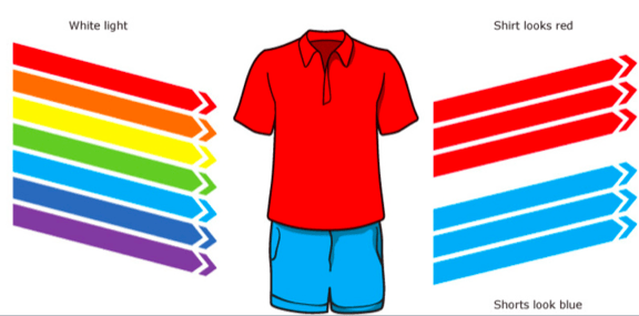 Objects appear different colors because they absorb some wavelengths and reflect back to us others. When we see a red shirt, what we’re really seeing is what’s left after all the other lightwaves—blue, green, purple, yellow—have been absorbed by that shirt. Only the red isn’t absorbed, so our eyes see red.