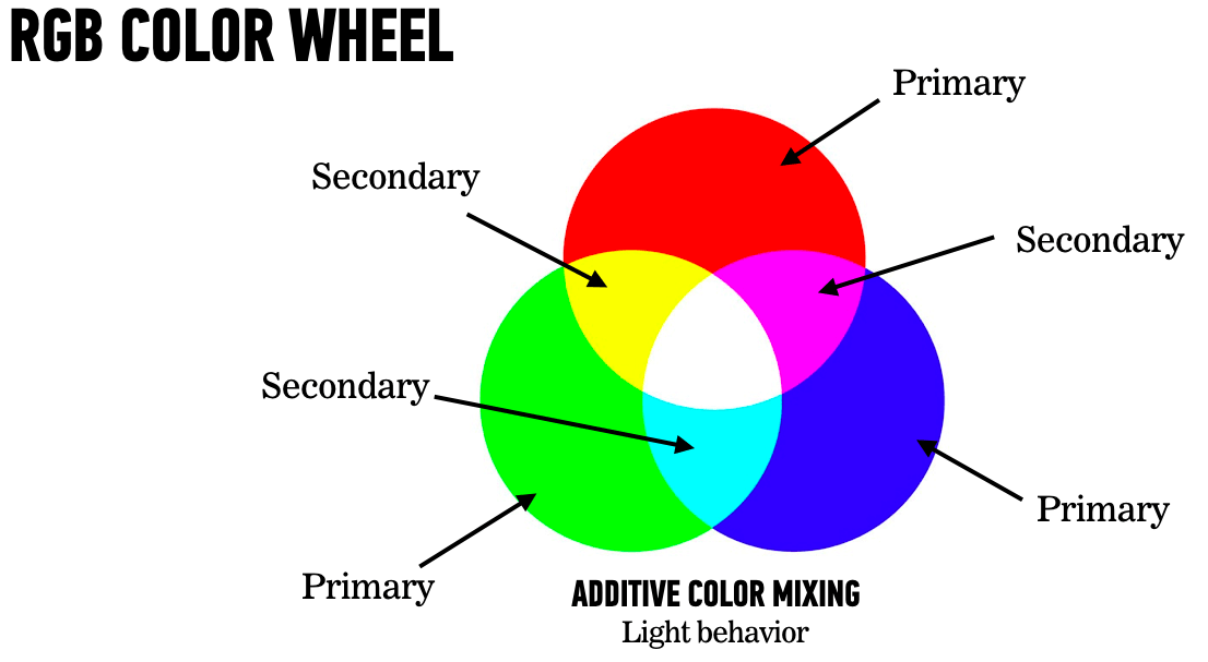 RGB stands for Red, Green and Blue, the primary colors in additive color system, and is based on how light behaves when it’s mixed together. Mix red and green light together and you get yellow. Mix green and blue light and get cyan. Mix all light together and you get white. Like looking at the reverse effect of sunlight through a prism.
